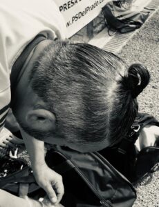 Breck looking like a slightly chunky Beckham was sporting a new stylish bob tied up with a rubber band in his hair blew the whistle starting the match as referee.