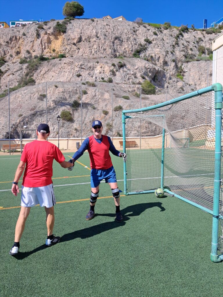 Blacks attack again. Keith in goal for the Reds is holding up the goal post up chatting to Ton in the stands, Ton surrounded by his friends. Welsh Steve has a look up and slots the ball home. Keith continues his chat with Ton. 3-3. Some warranted abuse from Keith’s team mates.